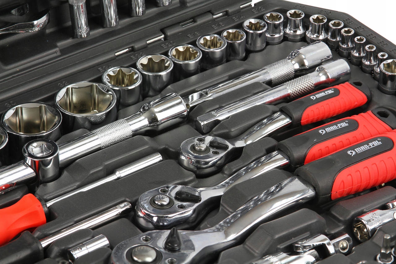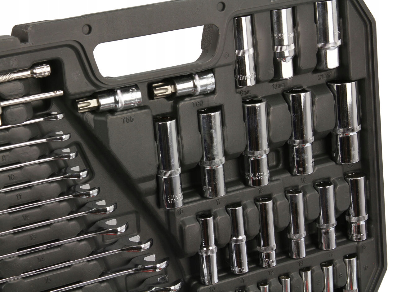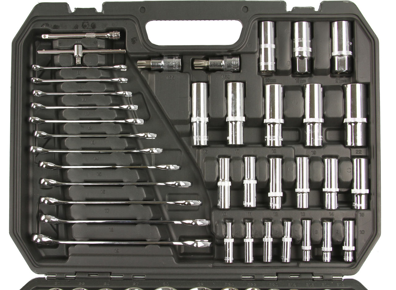 До комплекту входить повний набір довгих і коротких головок 1/4", 3/8" і 1/2", подовжувачів, карданних шарнірів і багатьох інших елементів, зокрема тріскачок із 72 зубцями. Така конфігурація робить набір придатним для використання з дрібні складальні роботи, механічний ремонт і багато інших робіт у господарстві або майстерні.